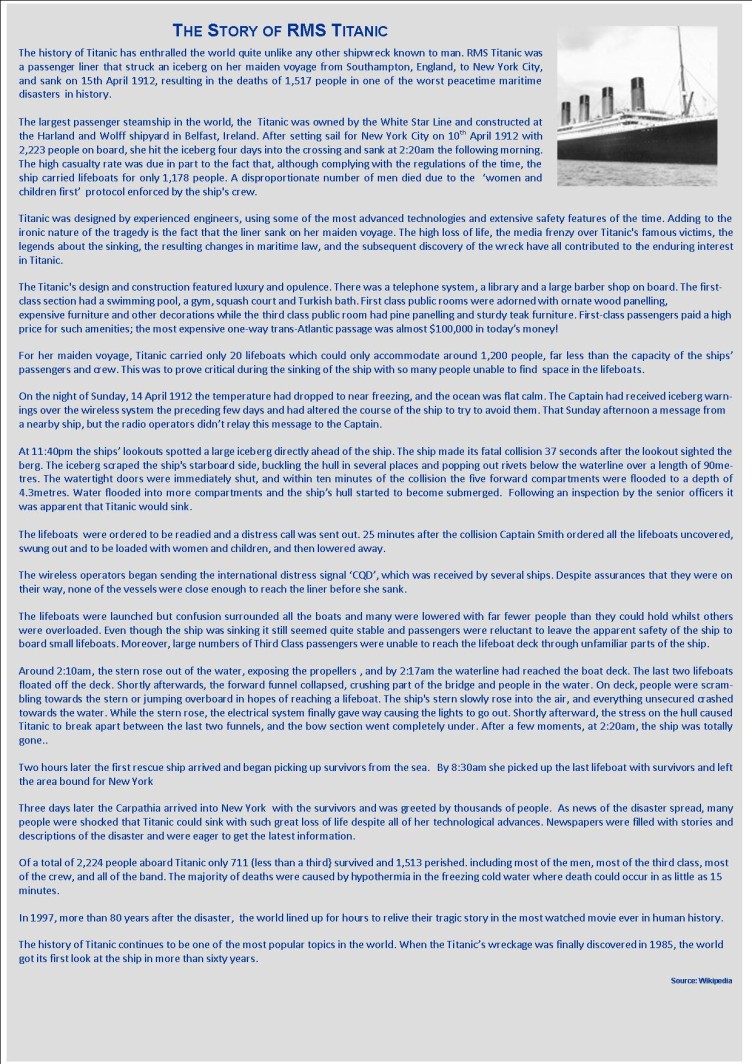 The Titanic sailed from Southampton on April 10, 1912 with 2228 passengers and crew. Only 705 people survived the voyage after the ship struck an iceberg in the North Atlantic on the night of April 15 and sank.